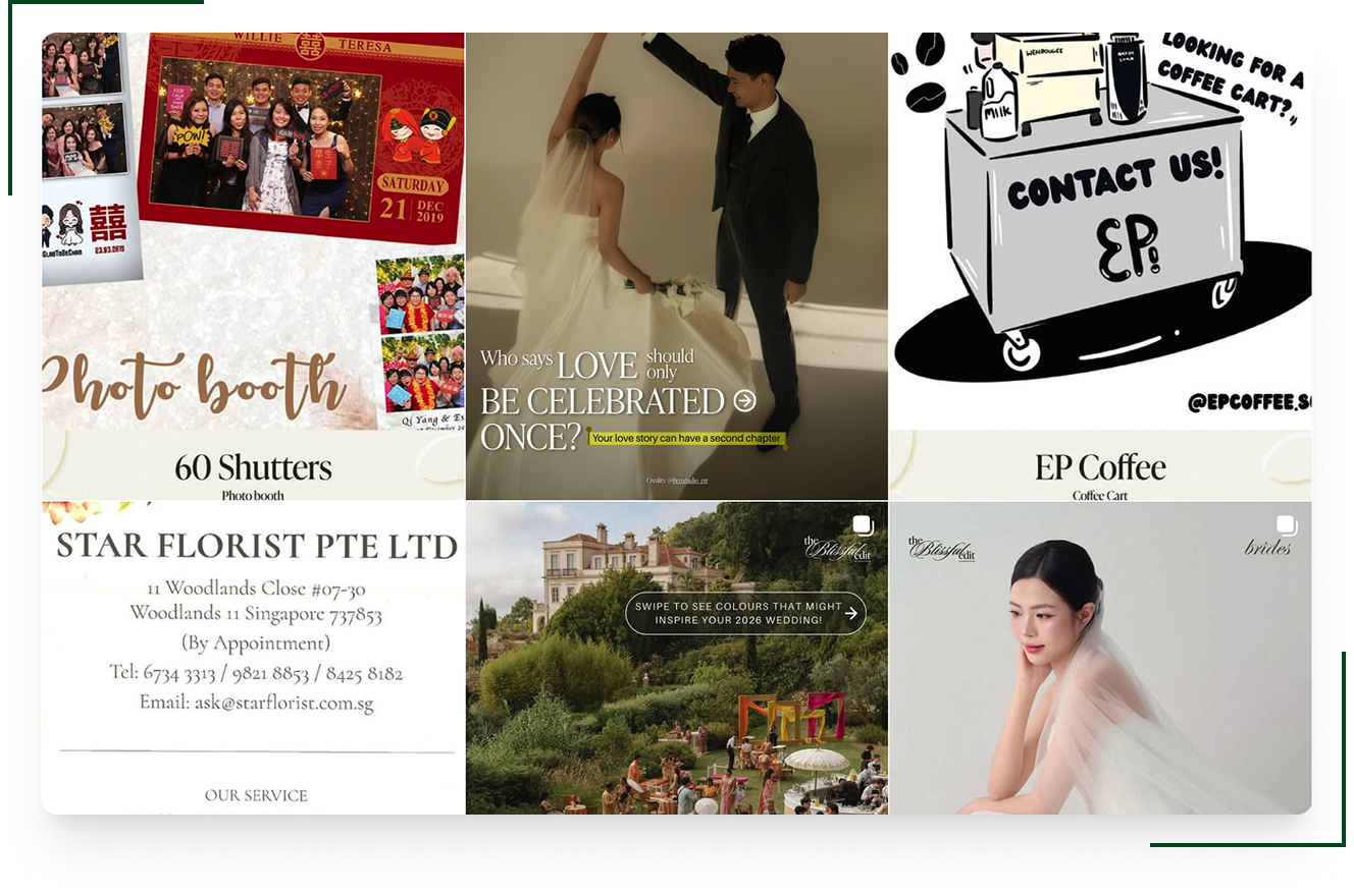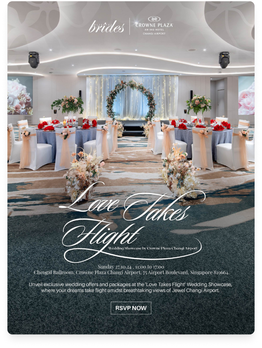 We have successfully collaborated with some of Singapore’s most prestigious hotels and wedding venues, combining our expertise in content, digital strategy, and community engagement to create experiences that resonate with both couples and businesses. Every collaboration is designed to maximize exposure, engagement, and bookings while enhancing the overall wedding experience for attendees.