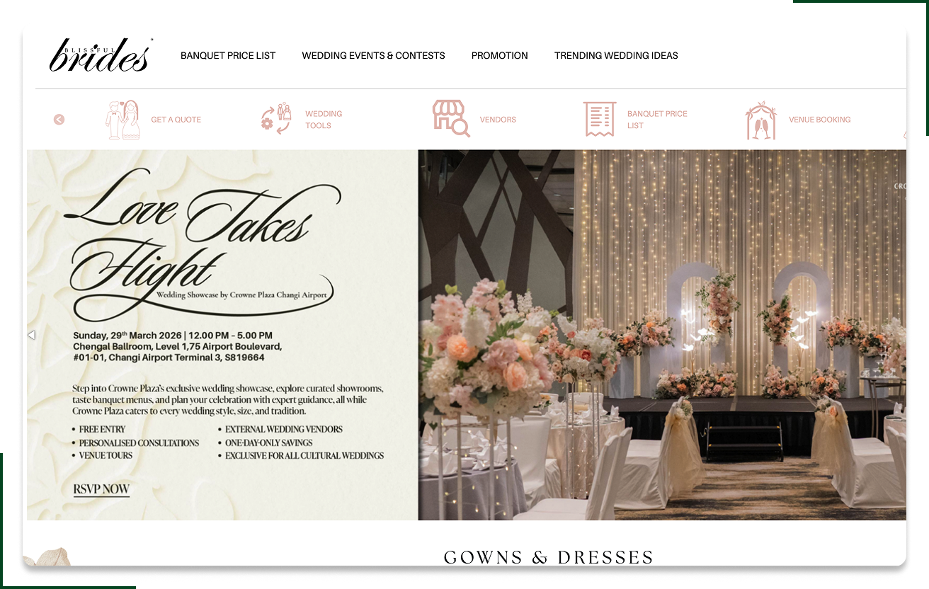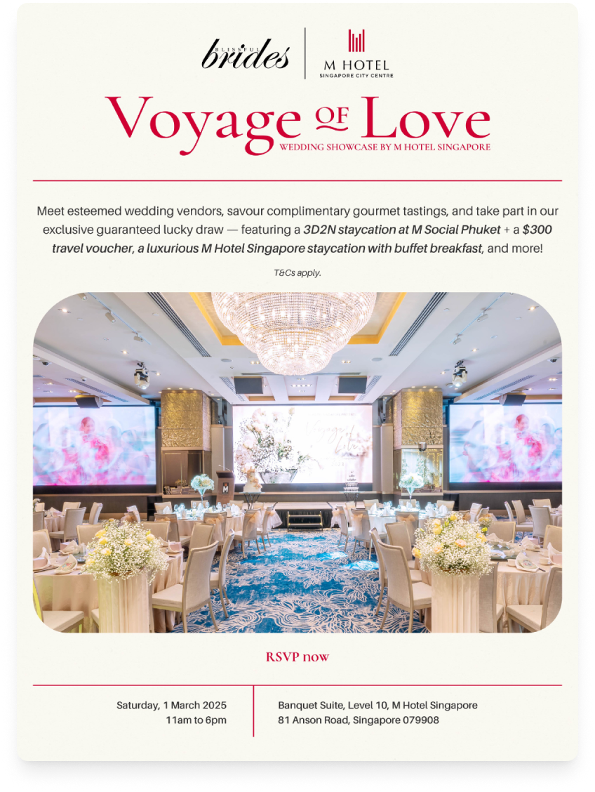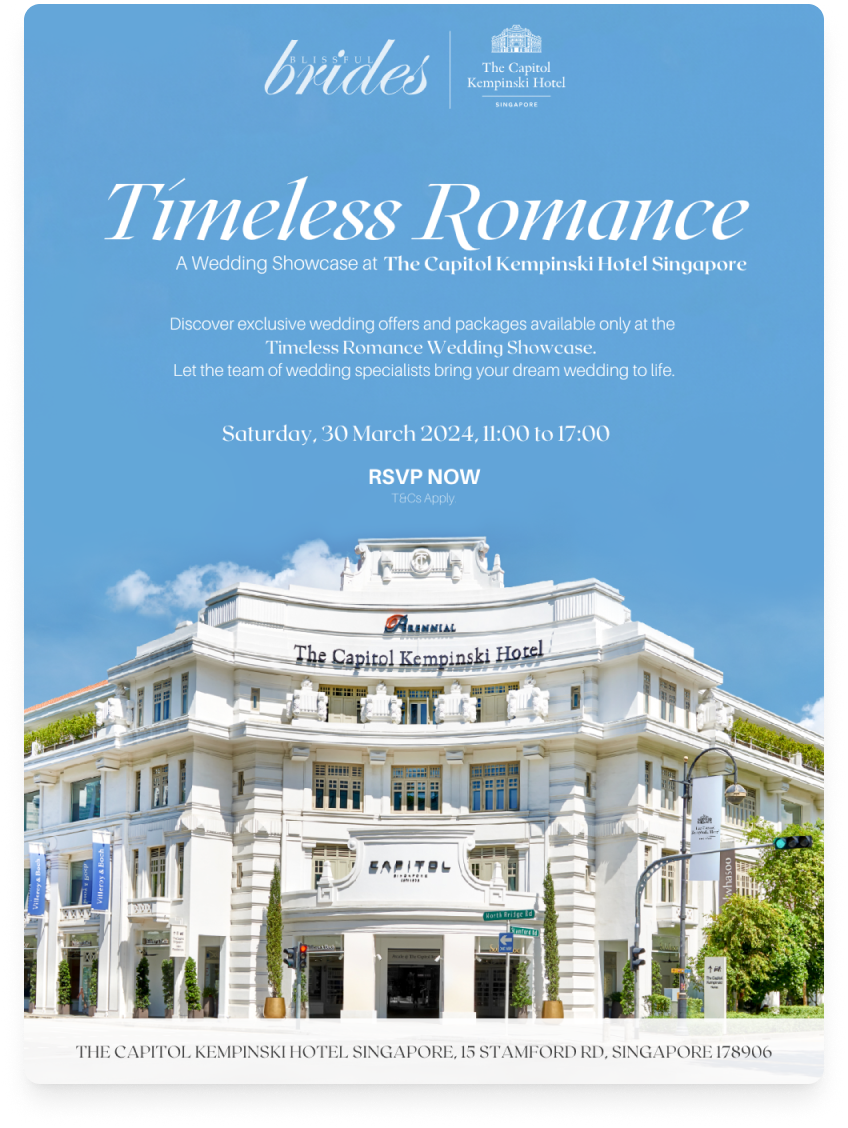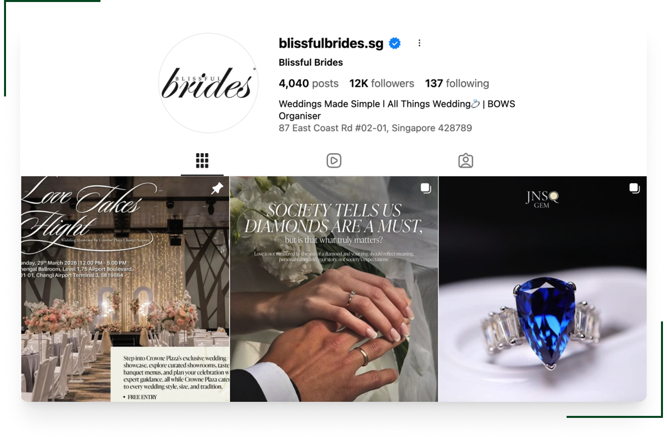 With over 12,000 followers on Instagram @blissfulbrides.sg and more than 362,000 followers on Facebook Blissful Brides, Blissful Brides’ social channels are more than just platforms. They are curated spaces where inspiration meets expertise. Every post is thoughtfully crafted to empower couples and elevate businesses in the wedding industry, from top hotel venues and bridal boutiques to overseas partners, providing insights and guidance that go beyond the ordinary.